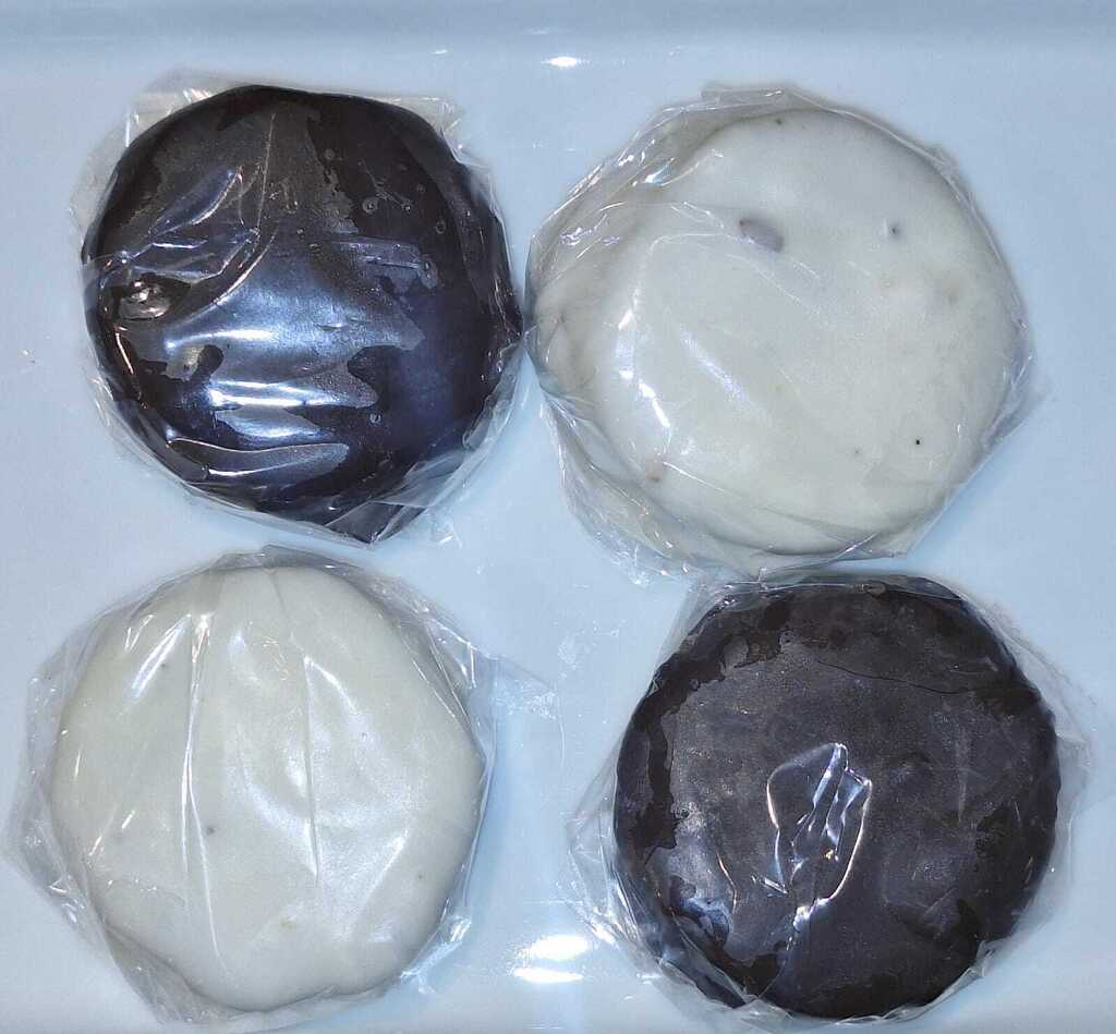 4 unidades de alfajorcitos envueltos individualmente, rellenos de dulce de leche y con cobertura de chocolate negro y blanco.